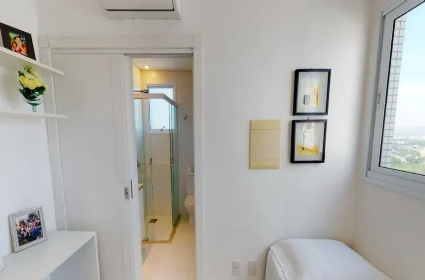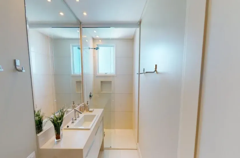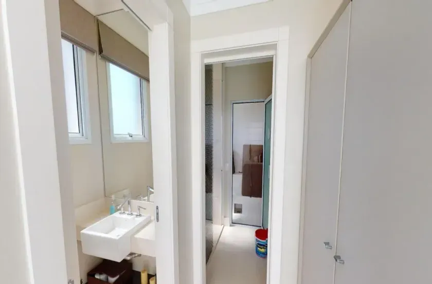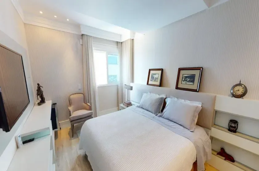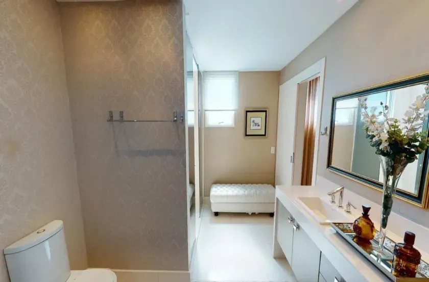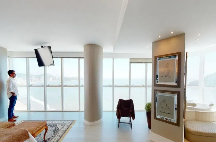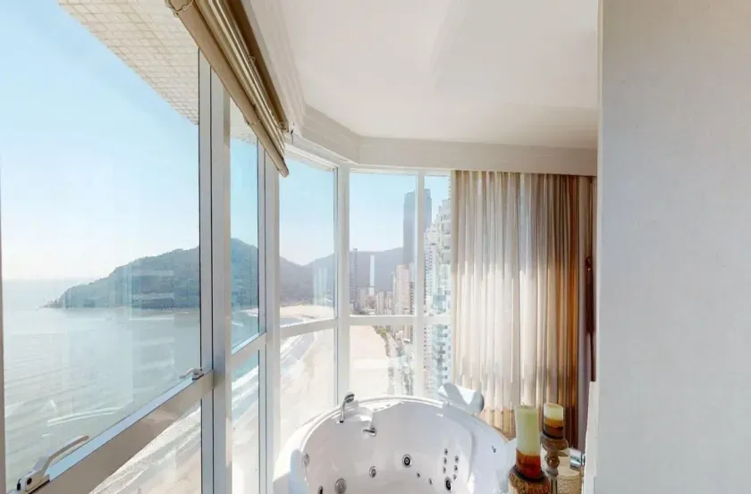 -Suíte máster com closet, amplo banheiro com banheira de hidromassagem, 2 chuveiros, 2 vasos sanitários e vista privilegiada